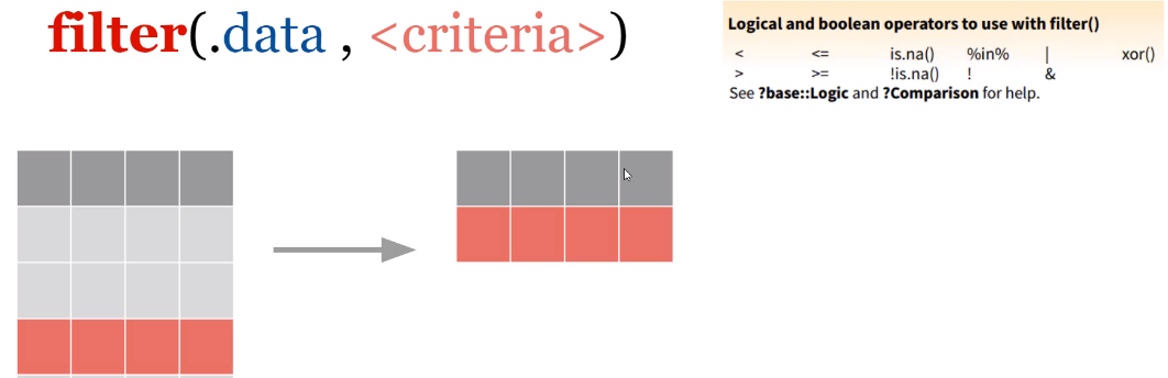 Aims to extract or obtain subsets of observations (rows) from the data table according to a logical condition.